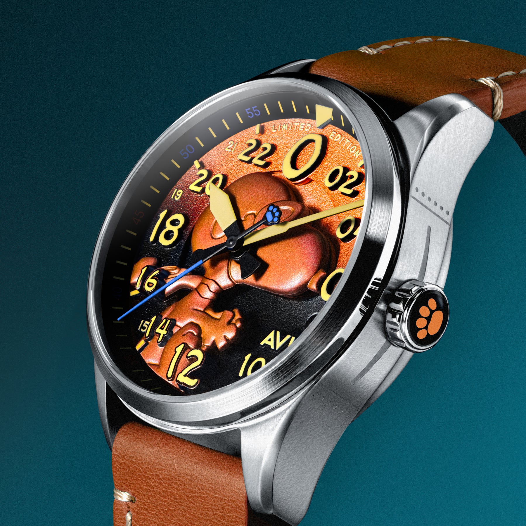 Celebrate the spirit of adventure with the legendary Snoopy. Taking the design of the bestselling Spitfire collection, this timepiece features a 3D Snoopy pilot on the dial and a custom Snoopy rotor at the caseback. Powered by a Japanese 24-hour automatic movement and finished with a genuine leather strap adorned with beloved Peanuts characters, this is a whimsical nod to the Flying Ace's spirit.